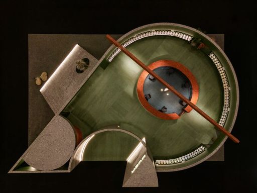 circular timber pavilion with voids and slits displays variety of veneer textures and finishes