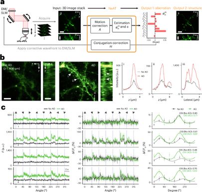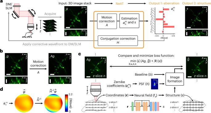 Correcting optical aberrations in living brains with two-photon microscopy using neural fields